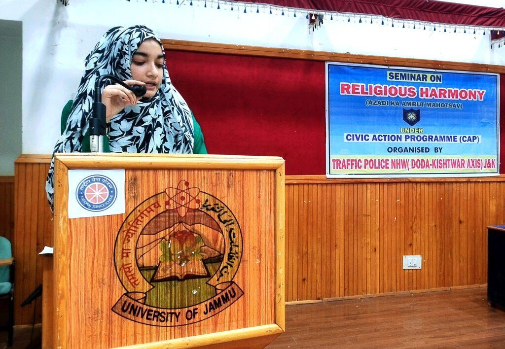 Bhadarwah July 28 : To promote religious harmony and to eliminate extremism from the society for peaceful living, which is imperative for holistic development, Traffic police NHW244 Doda Kishtwar axis organised a seminar on the topic Religious Harmony on Thursday as a part of Azadi Ka Amrut Mohatsav.