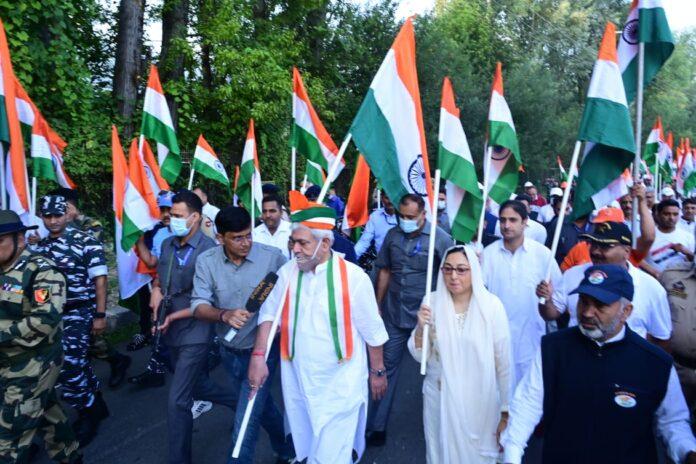 Lieutenant Governor Manoj Sinha Sunday joined people from all walks of life in a walkathon from Lalit Ghat to Botanical Garden to celebrate the ‘Har Ghar Tiranga’ Utsav.