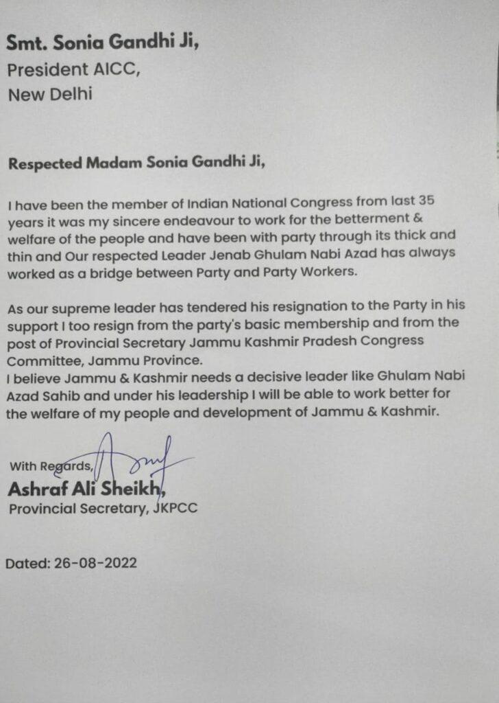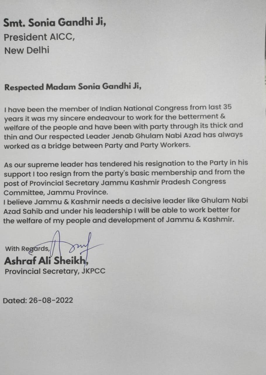 HomeNationalBig Jolt to Congress; Ashraf Ali resigns in support of Azad National Big Jolt to Congress; Ashraf Ali resigns in support of Azad By Himalayan Express August 27, 2022 103 Share FacebookTwitterPinterestWhatsAppEmailPrintTelegram Share FacebookTwitterPinterestWhatsAppEmailPrintTelegram Previous article5 ex-MLAs, Several leaders resign from Primary membership of CongressNext articleIndia reports 9,520 new COVID-19 cases RELATED ARTICLES International Main Accused Arrested in Firing on Car of Lawyer Linked to Lawrence Bishnoi in Delhi March 3, 2026 Jammu Global Oil Prices Surge 9% Amid US–Israel Strikes on Iran; Retail Fuel Prices in India Likely to Remain Stable March 3, 2026 National Govt Asks States To Keep Eye On Pro-Iran Radical Preachers Delivering Inflammatory Sermons March 2, 2026 LEAVE A REPLY Cancel reply Comment: Please enter your comment! Name:* Please enter your name here Email:* You have entered an incorrect email address! Please enter your email address here Website: Save my name, email, and website in this browser for the next time I comment. - Advertisment - Most Popular P V Sindhu Returns Home After Being Stranded in Dubai, Pulls Out of All England Championships March 3, 2026 Main Accused Arrested in Firing on Car of Lawyer Linked to Lawrence Bishnoi in Delhi March 3, 2026 Global Oil Prices Surge 9% Amid US–Israel Strikes on Iran; Retail Fuel Prices in India Likely to Remain Stable March 3, 2026 Govt Asks States To Keep Eye On Pro-Iran Radical Preachers Delivering Inflammatory Sermons March 2, 2026 Load more Recent Comments
