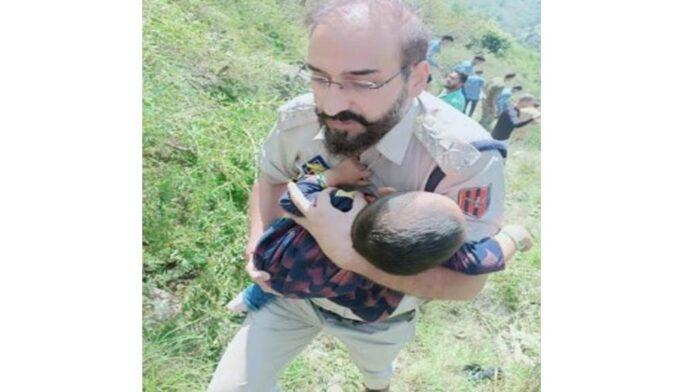 SDPO Manjakote Shamsheer Singh rescuing a minor child from bus accident site at Deri Ralyote in Manjakote tehsil area of Rajouri district.