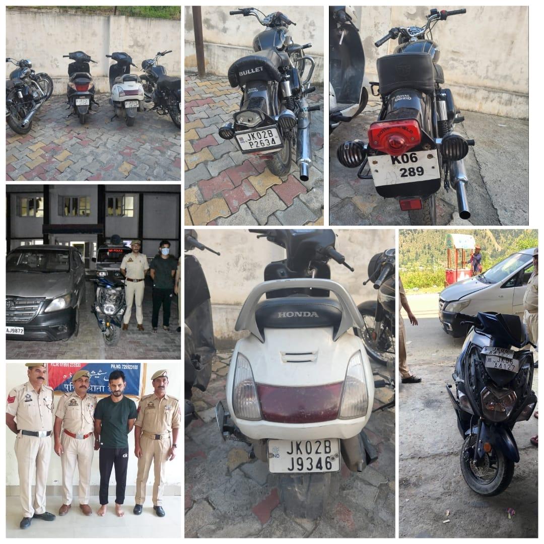 Police said to have succeeded to crack cases of bikes thefts from different area of Jammu and Kashmir and arrested one accused namely Shadab Mir son of Abdul Qayoom Mir resident of Dandi Bhaderwah who has been arrested in case FIR no.209/22 U/S 379 IPC.