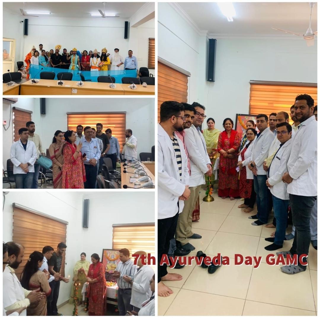 7th Ayurveda Day celebrated with enthusiasm at Govt. Ayuvedic Medical College Akhnoor with the theme Har Din Har Ghar Ayurveda (Ayurveda Everyday, Ayurveda Everywhere) to promote Ayurveda in leading a healthy life. Principal Prof. (Dr.) Shashi Sudhan in her address emphasis to adopt Ayurveda not only for treatment but also for prevention of disease process, so that burden of disease can be decreased. The programme commenced with Lamp lighting ceremony, Dhanwantri Vandana followed by a amazing skit on Lord Dhanwantri’s Avataran & Samudra Manthan presented by BAMS students under guidance of Dr. Sheetal Sharma & Dr. Anupama Thakur, department of Samhita & Siddhanta, GAMC Akhnoor. Dravyaguna department organized a workshop on Ayurveda in the Kitchen in which Dr. Rajesh Sharma & Dr. Dheeraj Khajuria explained the importance and scientific value of various herbs (spices) used in the kitchen like cumin seeds in anaemia, Tamarind in liver disorders, Clove for toothache, Trikatu most essential spices (Black Pepper, Long Pepper, Dry Ginger) for recurrent cough and obesity (in children). A Health check-up and free investigation camp organized by department of Roga Nidana under the leadership of Dr. Priya Puesh Pargotra, Associate Professor, GAMC. The function was attended by Accounts Officer, Statistical Officer, Faculty members, Non teaching staff, Hospital staff and BAMS students. Vote of thanks was presented by Dr. Twinkle Gupta, Associate Professor, GAMC.