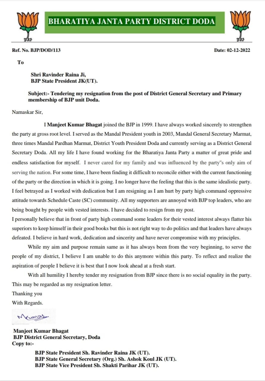 HomeChenab ValleyBig Jolt to BJP in Doda; District General Secretary Resigns Chenab ValleyPolitics Big Jolt to BJP in Doda; District General Secretary Resigns By Himalayan Express December 4, 2022 115 Share FacebookTwitterPinterestWhatsAppEmailPrintTelegram Manjeet Kumar Bhagat with Ramesh Parihar, Leader of Democratic Azad Party Share FacebookTwitterPinterestWhatsAppEmailPrintTelegram Previous articleBeware Online Shoppers, Here’s what Nykaa did!Next articleAt minus 3.4, J&K’s Srinagar records coldest night of the season so far RELATED ARTICLES International Kejriwal Asks PM Modi If Iran Will Allow Indian Ships Through Strait of Hormuz March 13, 2026 International Supreme Court Stays Part of Delhi High Court Order in Mahua Moitra Cash-for-Query Case March 13, 2026 International Om Birla Reaffirms Commitment to Fairness After No-Confidence Motion Fails March 12, 2026 LEAVE A REPLY Cancel reply Comment: Please enter your comment! Name:* Please enter your name here Email:* You have entered an incorrect email address! Please enter your email address here Website: Save my name, email, and website in this browser for the next time I comment. - Advertisment - Most Popular Approving Rs 100 Cr Fisheries Cluster In Anantnag Symbol Of PM Modi Led Govt’s Commitment Towards J&K: LG Sinha March 14, 2026 Over 2 Lakh Blooming Tulips Ready To Welcome Visitors At Picturesque Sanasar March 14, 2026 Crude Oil Prices Spike Above $115 A Barrel As Iran War Impedes Production, Shipping March 14, 2026 Reasi District Lawn Tennis Open Championship Concludes at Katra March 13, 2026 Load more Recent Comments