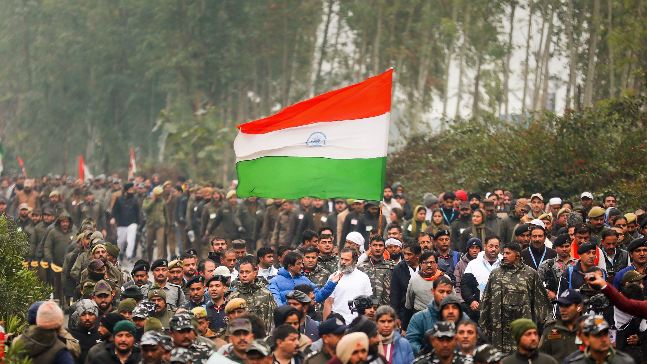 Gandhi donned a black raincoat over a white T-shirt. The yatra was scheduled to start at 7 am but was delayed by an hour and fifteen minutes apparently due to the inclement weather.