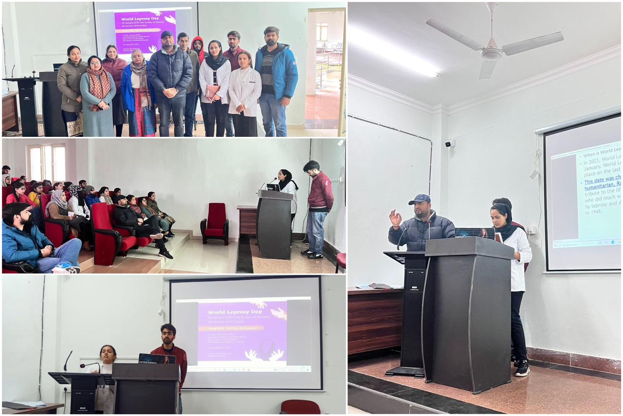 under the guidance of Prof Dr Shashi Sudan Sharma, Principal mam ,Nodal officer sir Dr Narinder Sharma and Mrs Seema Rani AO mam Department of Swasthavritta & Yoga Government Ayurvedic Medical college Akhnoor today celebrated World Leprosy day. During the event seminar and a health talk was conducted . A seminar on National leprosy Eradication program was conducted at GAMC Auditorium by Anisa student of third year. The whole event was coordinated by Dr Abhishek Magotra Associate Professor and Dr Sheetal Gupta Assistant professor department of Swasthavritta and yoga . Punika , Basit and Rahil all students of third year also actively participated in the event. Faculty and students were also presented during the event. Dr Sonakshi also expressed her view on the topic. Accounts officer Gamc was also attended the program.