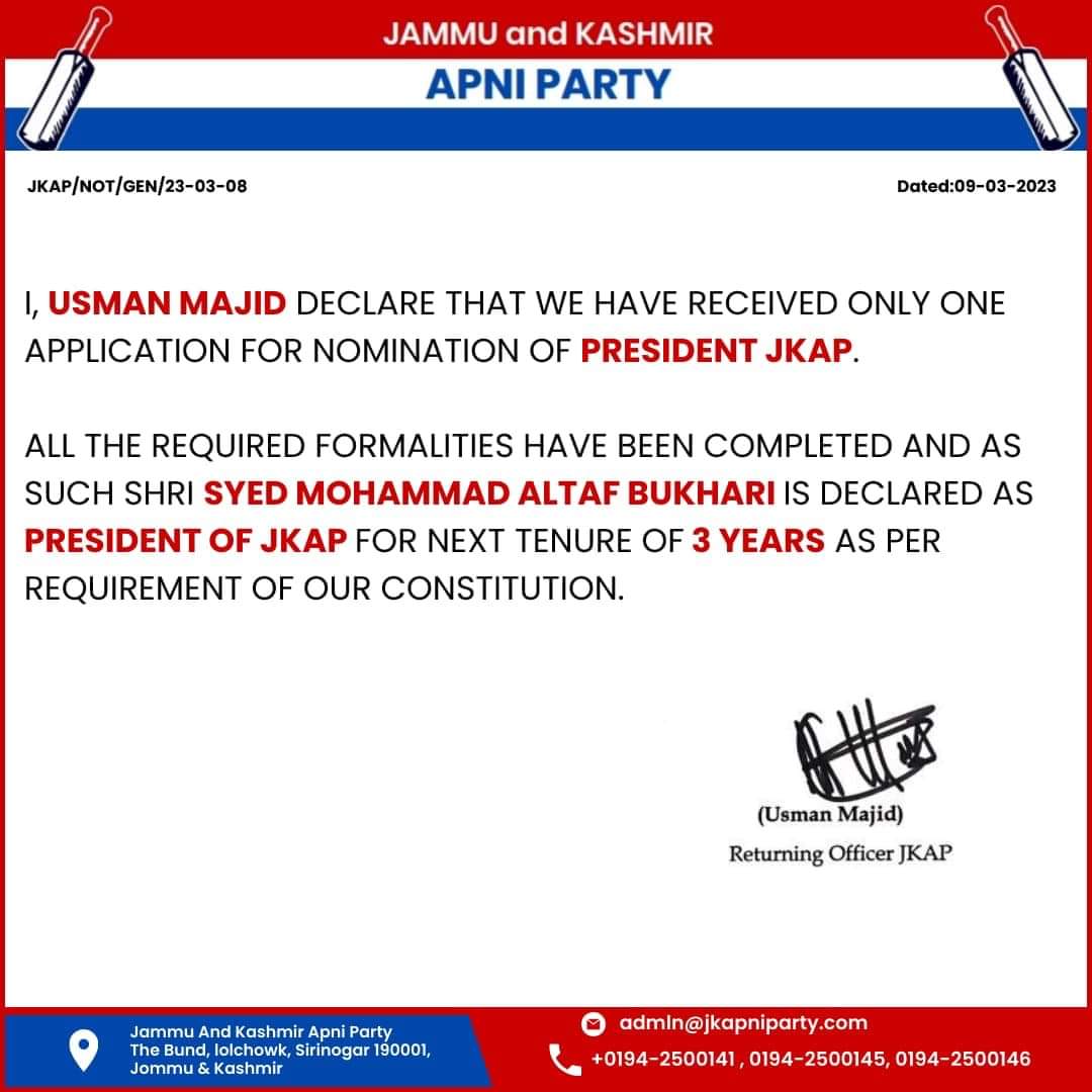 HomeJammuAltaf Bukhari elected Apni Party Chief for second term, unopposed JammuKashmir Altaf Bukhari elected Apni Party Chief for second term, unopposed By Himalayan Express March 10, 2023 52 Share FacebookTwitterPinterestWhatsAppEmailPrintTelegram Altaf Bukhari elected Apni Party Chief for second term, unopposed Share FacebookTwitterPinterestWhatsAppEmailPrintTelegram Previous articleWith eye on 2024 polls, BJP plans massive rallies for PM Modi in Lok Sabha seats lost in 2019Next articleAnurag Thakur on NYT report on Kashmir: ‘Sole motive to spread propaganda about India’ RELATED ARTICLES Jammu Airtel Extends Connectivity to Remote Marwah Region March 10, 2026 Jammu J&K Govt Directs DDOs to Ensure Strict Compliance in Works Contract Payments March 7, 2026 Jammu Global Oil Prices Surge 9% Amid US–Israel Strikes on Iran; Retail Fuel Prices in India Likely to Remain Stable March 3, 2026 LEAVE A REPLY Cancel reply Comment: Please enter your comment! Name:* Please enter your name here Email:* You have entered an incorrect email address! Please enter your email address here Website: Save my name, email, and website in this browser for the next time I comment. - Advertisment - Most Popular Om Birla Reaffirms Commitment to Fairness After No-Confidence Motion Fails March 12, 2026 Navneet Kaur Hat-Trick Powers India to 4–1 Win Over Wales in Hockey World Cup Qualifiers March 12, 2026 Shubman Gill Set to Be Named BCCI Cricketer of the Year March 12, 2026 Government Assures Adequate LPG Supply Amid Panic Buying Concerns March 12, 2026 Load more Recent Comments
