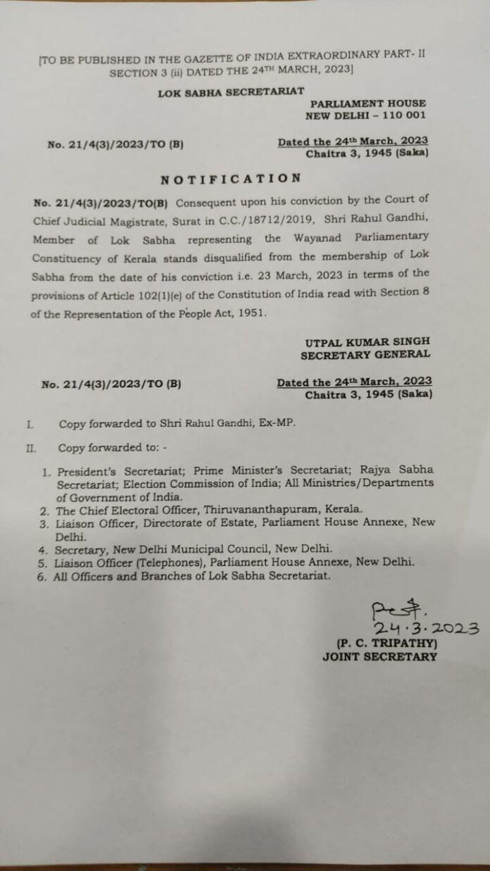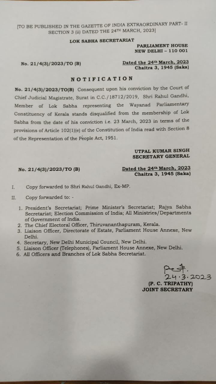 “Consequent upon his conviction by the Court of Chief Judicial Magistrate, Surat…Rahul Gandhi, Member of Lok Sabha representing the Wayanad Parliamentary Constituency of Kerala stands disqualified from the membership of Lok Sabha from the date of his conviction i.e. 23 March, 2023,” the notification read.