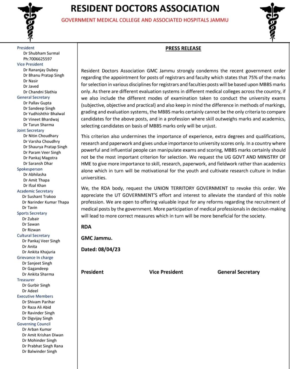The Resident Doctors Association (RDA) of Jammu has recently spoken out against a new government order regarding the appointment of registrars and faculty in medical colleges. The order states that 75% of the selection marks for these positions will be based solely on MBBS marks, an evaluation criterion that the RDA vehemently opposes.