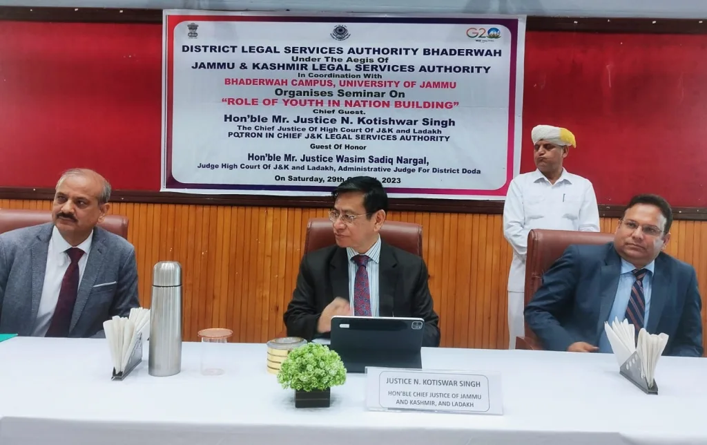Bhadarwah, Apr 29: Chief Justice of Common High Court of UTs of J&K and Ladakh Justice N.Kotiswar Singh, who is on maiden visit to Doda and Bhadarwah valley along Justice Wasim Sadiq Nargal addressed students at Lal-Ded Auditorium on the topic ”Role of Youth In Nation Building’ and also planted saplings of Chinar trees in the premises of campus.