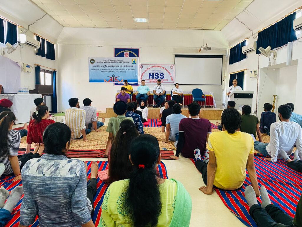a Yoga awareness camp organised by the Department of Swasthavritta and Yoga, Govt. Ayurvedic Medical College Akhnoor at GCET Jammu in order to increase awareness among students and general public regarding upcoming International Day of Yoga. In the program students and Faculty performed Yoga Asana and Pranayam as per Protocol by Ministry of AYUSH Govt of India.