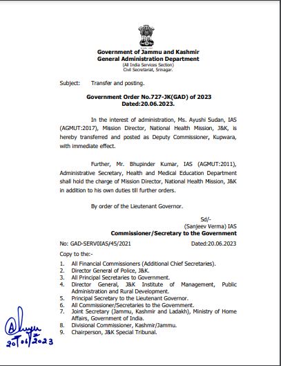 HomeJammuAyushi Sudan Appointed as New DC of Kupwara; Bhupinder Kumar Takes Additional... JammuJammu KashmirKashmir Ayushi Sudan Appointed as New DC of Kupwara; Bhupinder Kumar Takes Additional Charge of NHM By Himalayan Express June 21, 2023 39 Share FacebookTwitterPinterestWhatsAppEmailPrintTelegram Share FacebookTwitterPinterestWhatsAppEmailPrintTelegram Previous articleLegal traineeship program of ROC concludes at SrinagarNext articleGMC Doda Celebrates 9th International Yoga Day with DDC Chairman RELATED ARTICLES Jammu J&K Govt Directs DDOs to Ensure Strict Compliance in Works Contract Payments March 7, 2026 Jammu Global Oil Prices Surge 9% Amid US–Israel Strikes on Iran; Retail Fuel Prices in India Likely to Remain Stable March 3, 2026 Jammu FirstCry Intellitots Preschool & Daycare Inaugurates by Kuwarani Ritu Singh ji & Its First Centre in Jammu March 1, 2026 LEAVE A REPLY Cancel reply Comment: Please enter your comment! Name:* Please enter your name here Email:* You have entered an incorrect email address! Please enter your email address here Website: Save my name, email, and website in this browser for the next time I comment. - Advertisment - Most Popular J&K Govt Directs DDOs to Ensure Strict Compliance in Works Contract Payments March 7, 2026 Missile Strikes Escalate as Iran and Israel Trade Attacks; Global Tensions Rise March 7, 2026 Hindu Mahasabha Seeks Action Against Kamaraj for Allegedly Defaming Isha March 5, 2026 Nitish Announces Rajya Sabha Foray, Ending Tenure As Bihar’s Longest-Serving CM March 5, 2026 Load more Recent Comments