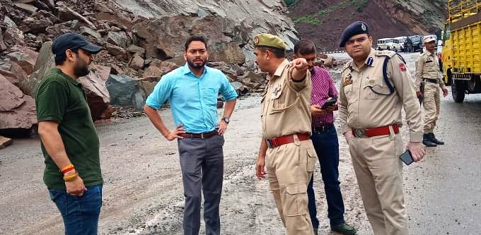 UDHAMPUR, JULY 20: To assess the ground situation arisen due to incessant rains and landslides, Deputy Commissioner Udhampur, Sachin Kumar Vaishya, along with SSP Dr Vinod Kumar visited landslide hit spot on Dewal Bridge and inspected the restoration work over there.