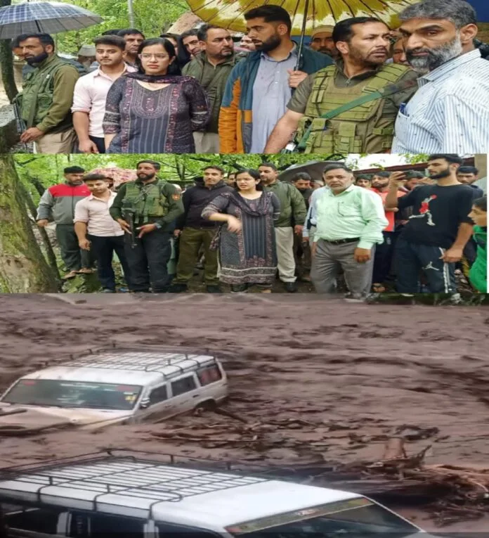 KUPWARA, JULY 24: The District Development Commissioner (DDC) Kupwara, Ayushi Sudan Sunday visited flash flood hit areas of Hayhama, Kalaroos and Lolab to take on-spot inspection of the situation arises due to flash floods.