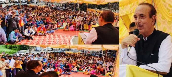 Doda, Aug 5: Chairman Democratic Progressive Azad Party Ghulam Nabi Azad on Saturday said that DPAP is committed to the development of Chenab Valley and his party works above the politics of religion and region as proved by him during his short tenure of two and half years as chief minister of Jammu and Kashmir. “Chenab Valley continues to remain underdeveloped after so many decades due to politics of indifference. I and my party (DPAP) stands committed to the development of all far-flung areas in Jammu and Kashmir which saw a golden era of progress during my tenure as chief minister even though it was short period of two and half years,” Azad said at a well-attended maiden public meeting in Gaglla area of Doda district. Azad cautioned people about elements inimical to peace by vitiating social harmony in Jammu and Kashmir, saying divisive elements are hell bent to disturb peace among communities in the region. “The strong bonding between different communities in Chenab Valley and Pir Panjal is clear example of how people uphold and cherish secular values in their respective communities by living in harmony for ages despite attempts to vitiate peace in neighbourhoods,” Azad said on the first day of his tour in Chenab Valley. Directing DPAP leadership and party workers to strive and strengthen bonds of social cohesion, Azad stressed that development is linked to peace and stability. “Jammu and Kashmir has already suffered during 33 years of militancy with loss of precious lives, collapse of economy, underdevelopment and neglect. We can’t afford instability in the region as elements are out there to exploit and vitiate the peaceful atmosphere thereby the need of hour is to remain vigilant and united,” Azad affirmed. The public meeting was also addressed by–Vice Chairman G.M.Saroori, Ab Majeed Wani Gen Secretary, Sr DPAP leader Ramesh Parihar, Asif Ghattu Distt President Doda .