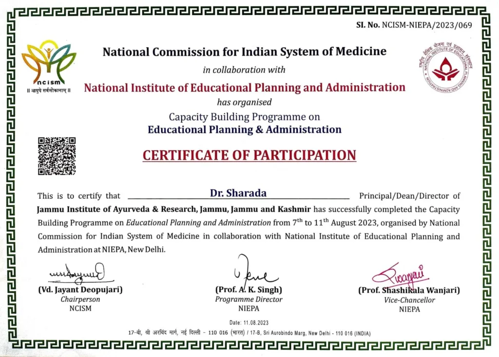 Jammu : Principal of Jammu Institute of Ayurveda and Research, Jammu,Dr Sharada successfully completed five days Capacity Development Program in Educational Planning and Administration organised by National Commission for Indian System of Medicine NCISM,Ministry of AYUSH,Government of India,New Delhi in collaboration with National Institute of Educational Training and Administration NIEPA(Deemed to be University),Ministry of Education,Government of India from 7th-11th August in NIEPA Campus,New Delhi.