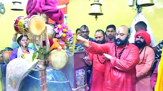 Srinagar : On August 17th, in observance of “Shravan Shukla Paksha Pratipada,” the revered silver mace, Charri Mubarak, of Swami Amarnath was ceremoniously transported to the ancient ‘Sharika-Bhawani’ Temple in Srinagar. Led by Mahant Deependra Giri ji, the custodian of Charri Mubarak, the procession proceeded to the Hari Parvat temple to offer reverence to the Goddess, following age-old traditions.