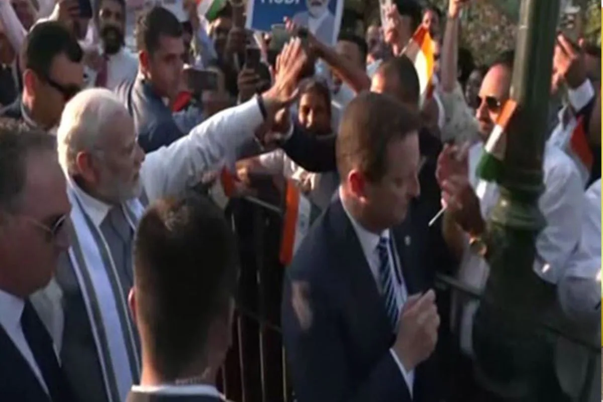 With enthusiastic cheers of ‘Bharat Mata ki Jai’ and ‘Modi, Modi,’ Prime Minister Narendra Modi received a warm reception upon his arrival at the Hotel Grande Bretagne.