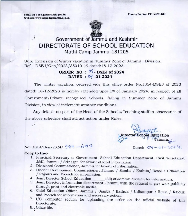 HomeJammuExtension of Winter Vacation in Jammu Schools until January 6 JammuJammu KashmirKashmir Extension of Winter Vacation in Jammu Schools until January 6 By Himalayan Express January 4, 2024 34 Share FacebookTwitterPinterestWhatsAppEmailPrintTelegram Share FacebookTwitterPinterestWhatsAppEmailPrintTelegram Previous articleCurrent Active COVID-19 Cases in the Country Stand at 4,423Next articlePrime Minister Modi Scheduled to Participate in Conference of Police DGs/IGs on January 6-7 RELATED ARTICLES Jammu Reasi District Lawn Tennis Open Championship Concludes at Katra March 13, 2026 Jammu Over 23,000 Grievances from J&K Received on CPGRAMS in Three Years March 13, 2026 Jammu Manoj Sinha, Omar Abdullah Extend Greetings on Jumat-ul-Vida March 13, 2026 LEAVE A REPLY Cancel reply Comment: Please enter your comment! Name:* Please enter your name here Email:* You have entered an incorrect email address! Please enter your email address here Website: Save my name, email, and website in this browser for the next time I comment. - Advertisment - Most Popular Reasi District Lawn Tennis Open Championship Concludes at Katra March 13, 2026 Kejriwal Asks PM Modi If Iran Will Allow Indian Ships Through Strait of Hormuz March 13, 2026 Supreme Court Stays Part of Delhi High Court Order in Mahua Moitra Cash-for-Query Case March 13, 2026 Over 23,000 Grievances from J&K Received on CPGRAMS in Three Years March 13, 2026 Load more Recent Comments