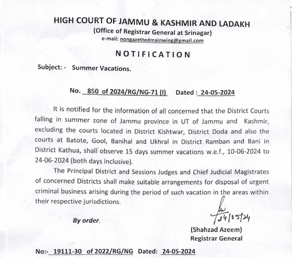 Jammu : District Courts in the summer zone of Jammu province, except for those in Kishtwar, Doda, and specific courts in Ramban and Kathua, will undergo a 15-day summer vacation from June 10 to June 24, 2024. An order from the High Court of Jammu and Kashmir and Ladakh instructs principal district and sessions judges, along with Chief Judicial Magistrates of the respective districts, to oversee the disposal of urgent criminal cases within their jurisdictions during this period.