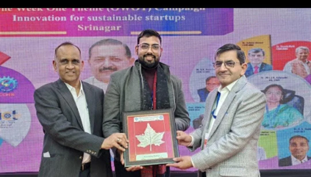 Jammu : Herbal Aura, founded by Ishvanku Saraf 2nd year student Of Jammu Institute of Ayurvedic and Research ( JIAR ) has been honored with the Promising Startup Award at the CSIR-Healthcare Theme Conclave during the One Week One Theme Campaign: Innovation for Sustainable Startups. The prestigious event was held at the iconic Sher-i-Kashmir International Conference Centre (SKICC), Srinagar.