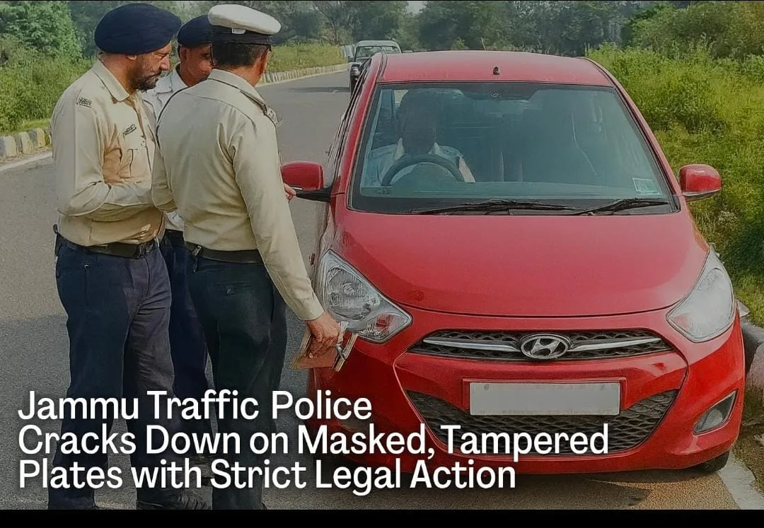 August 21: The Traffic Police City Jammu has issued a strict public notice warning vehicle owners against masking or tampering with registration number plates, terming it a serious violation of the Motor Vehicles Act as well as an offence under the Bharatiya Nyaya Sanhita (BNS).According to the notice issued by Farooq Qaiser, Sr. Superintendent of Police, Traffic City Jammu, it has been observed that a large number of vehicles in District Jammu are plying with masked or altered registration plates to evade detection by surveillance cameras and challaning authorities.The order highlights that offenders often cover number plates with hands, bags, face masks, stickers, tapes, mud or dirt, or alter/conceal digits and alphabets. Some even bend plates to make them unreadable, use fake numbers, or remove plates altogether.The notice warns that such practices are not only aimed at avoiding traffic penalties but are also misused by criminals in cases of abduction, chain snatching, hit-and-run, theft, robbery, and even by anti-national elements to commit terrorist acts.Citing Section 39/192 of the MV Act, the police stated that violators will face a fine of ₹5,000 for the first offence and ₹10,000 for repeat offences. Additionally, provisions of BNS relating to forgery and cheating may also apply, leading to registration of FIRs.The public has been given three days’ time from the issuance of the notice to comply and ensure their number plates are clear and as per law. Failing this, strict legal action will be taken.The SSP Traffic Jammu appealed to all citizens to cooperate in maintaining law and order and to desist from such unlawful practices immediately.