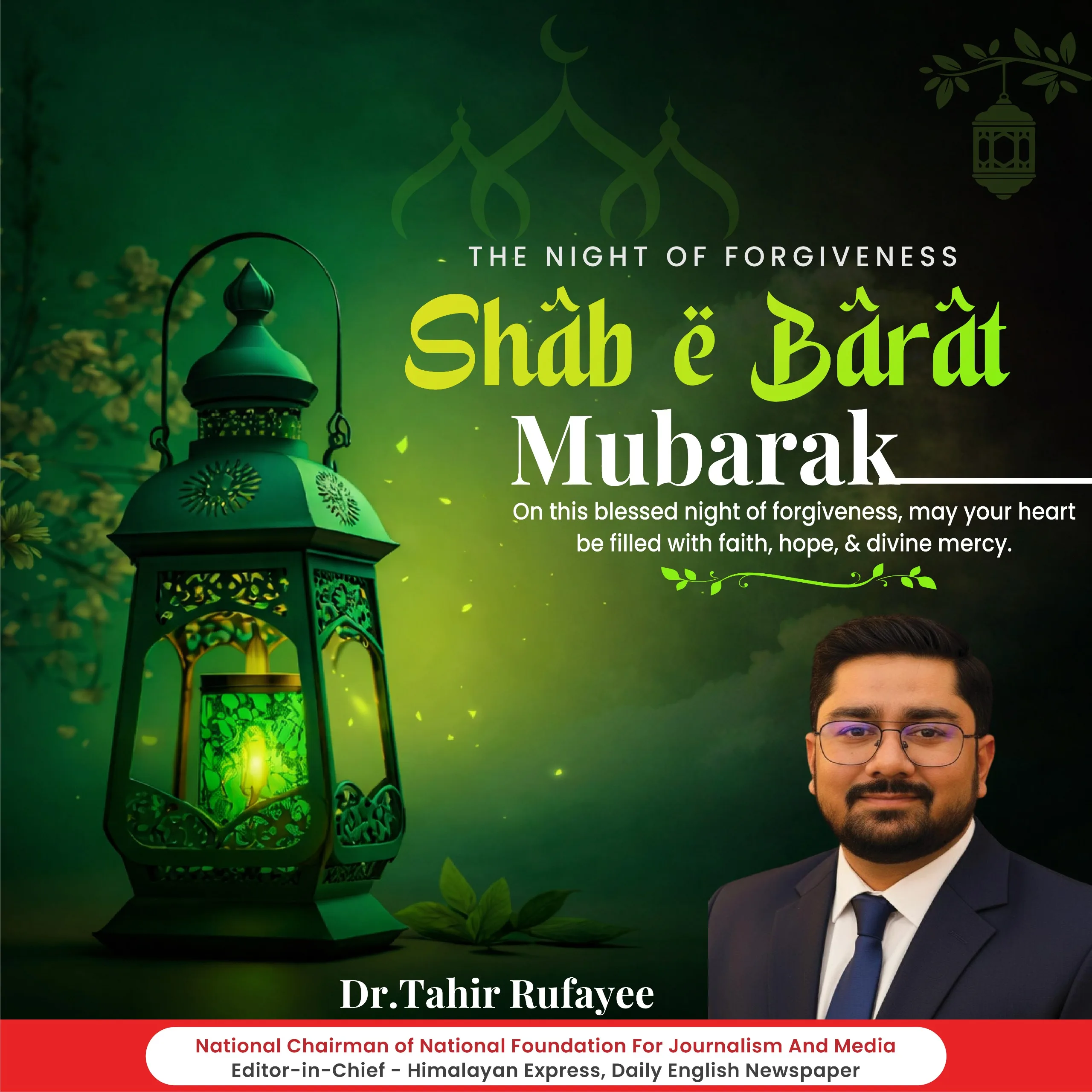 Jammu, 03 February: National Chairman of the National Foundation For Journalism and Media, Dr. Tahir Rufayee, has extended his heartfelt greetings to the people on the auspicious occasion of Shab-e-Barat.